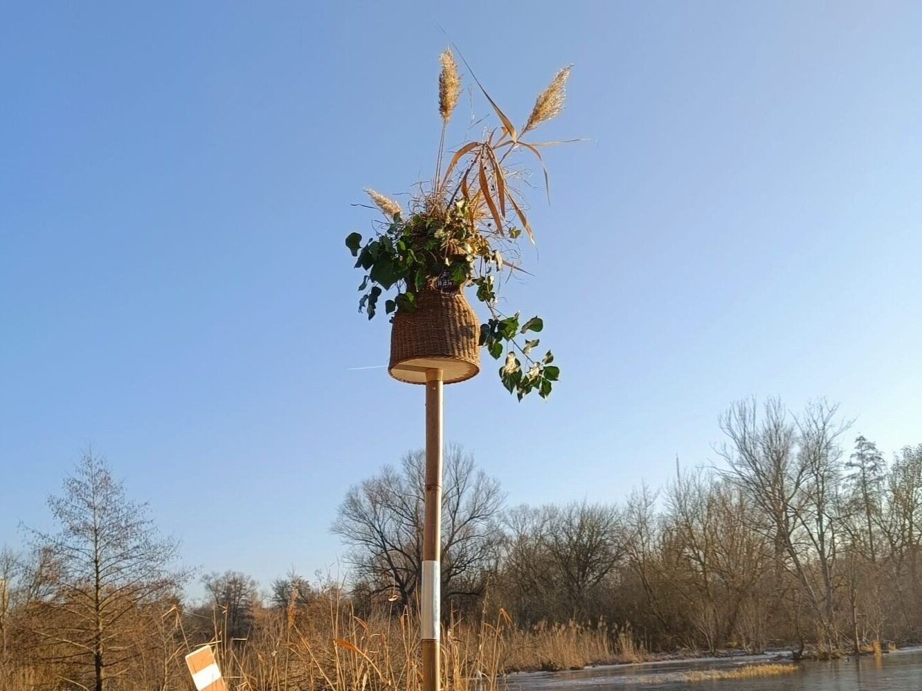 This intervention focuses on the specific nesting needs of the common goldeneye. Instead of attaching traditional nest boxes directly to trees, the team developed a freestanding solution using natural materials such as bamboo and woven elements .